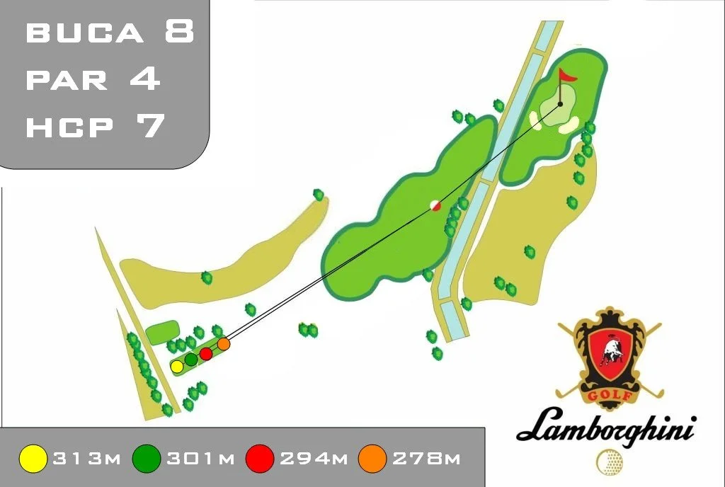 La buca 8, di recente re-design, è una buca che spinge il golfista a ragionare. E’ una buca strategica che impone una scelta se assestare il tee shot lungo e al centro del fairway che piega in un dogleg insidioso, oppure tirare comodi corti ma con un fairway protetti dai bunker a sinistra.
